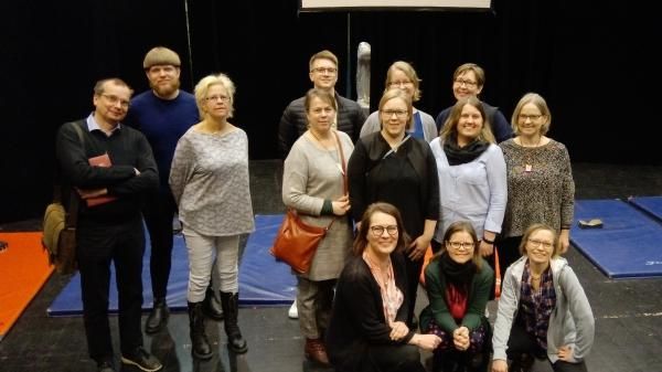 Nästan alla deltagare i studieresan samlade på Månteaterns scen.