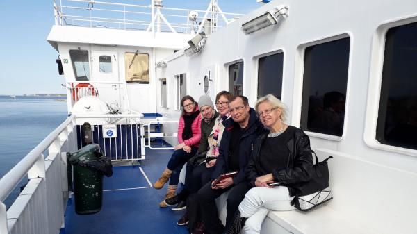 Färjan på väg till Ven. Fr.v. Laura Holm, Annica Reini, Ulrika Taylor, Cay Irjala, Beatrice Villman.