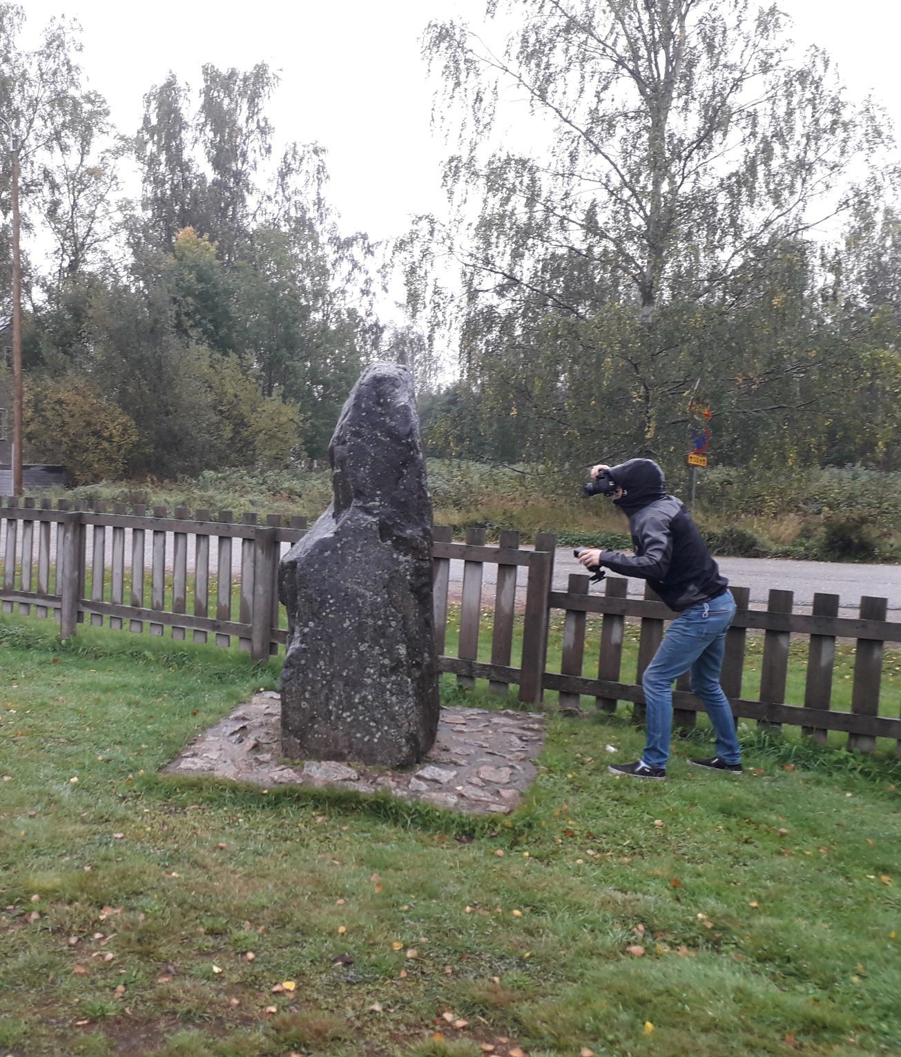 Bildmaterialet för utställningen produceras i samarbete med projekt Boden, där Kim Blåfield med skickligt kameragrepp och drönarbilder fångar medeltidsspår i vårt landskap. På bilden ses Kim fotografera minnesstenen i Pjelax över byns söner Fredrik och Rötger Trast som på 1400-talet gjorde prästkarriär inom Åbo stift. Bröderna uppträder i över tio medeltidsdokument, fler än någon annan enskild österbottning.