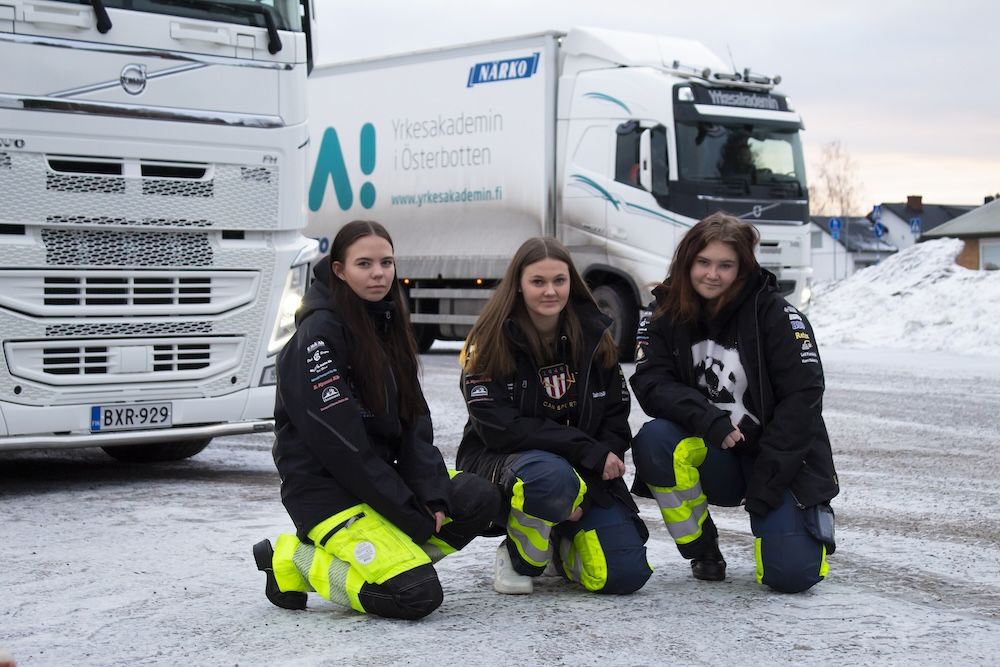 Tindra, Aina och Lizette studerar alla andra året på logistik på YA i Närpes. De berättar att de valde studier på YA för att de var intresserade av mer praktiska studier och arbete. De visste alla att logistik var deras första alternativ när de sökte in till YA. Ingen av dem har hållit på särskilt mycket med fordon och skruvande tidigare, men de har följt med i lastbilshytten med familj och släktingar redan från det att de var små.