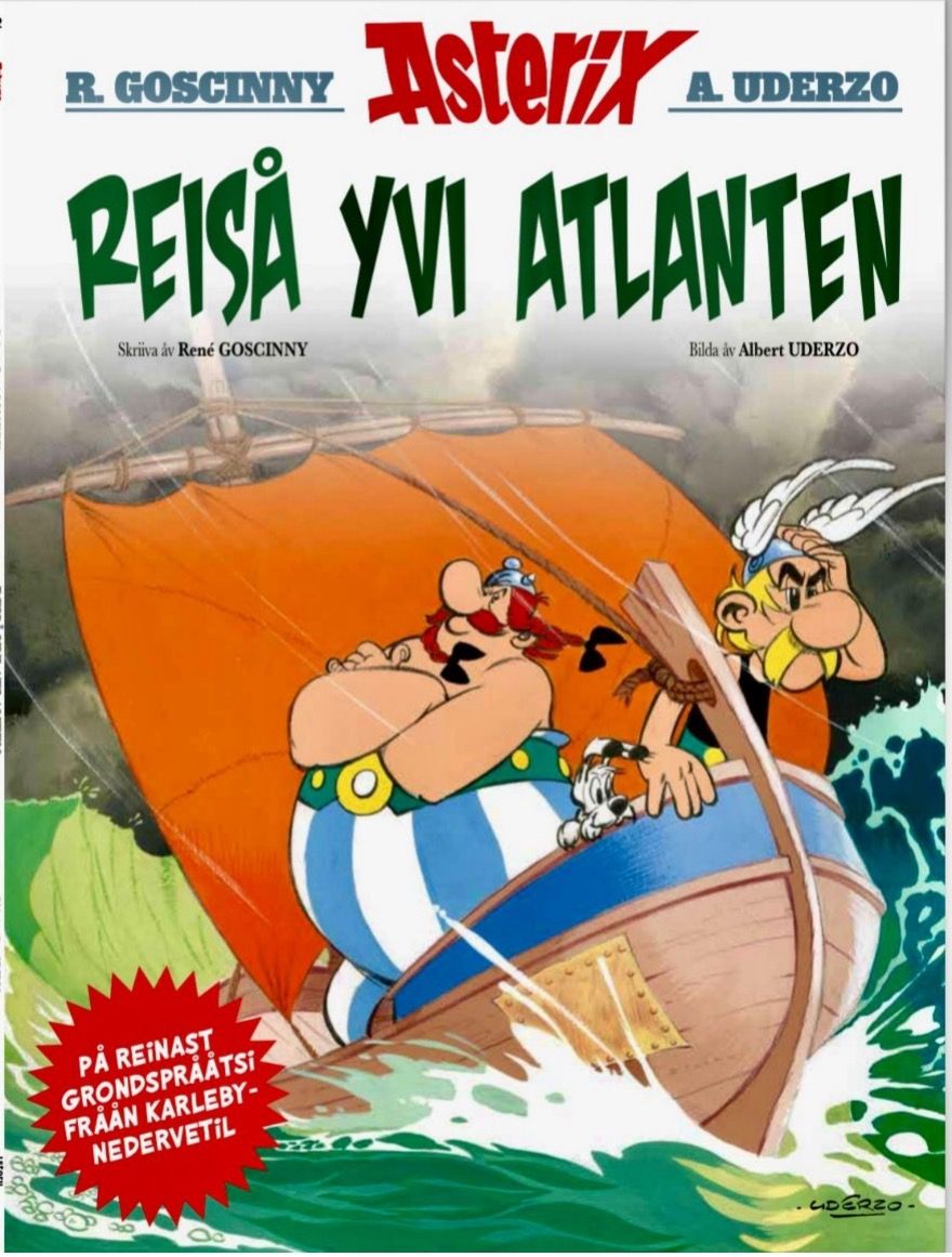 Det är Obelix som uttalar de orden, i Asterix-albumet "Reiså yvi Atlanten". Den första upplagan av Asterix på "grondsprååtsi" dvs. Karleby–Nedervetil-dialekt, såldes slut på bara några veckor, och nu har precis en andra upplaga kommit ut.